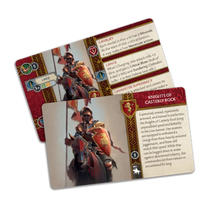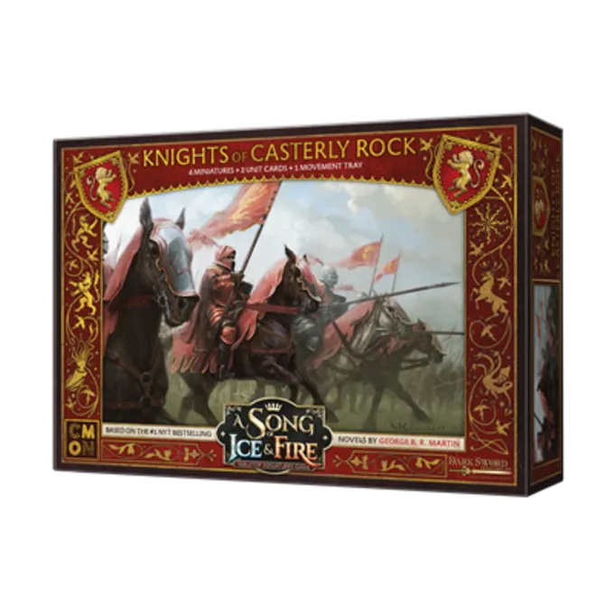 Lannister Knights of Casterly Rock Unit Box til A Song of Ice and Fire: Tabletop Miniatures Game bringer en hurtig, hårdt ramt og holdbar enhed til slagmarken. Da de er kavaleri, får de en ekstra bevægelse i starten af deres aktivering. De er også dødbringende på anklagen, hvor deres våben får kritisk slag og sundere. Fjender vil hurtigt blive modløs at kæmpe mod dem og blive tvunget til at lave panikprøver, hver gang ridderne overlever en kamprunde.