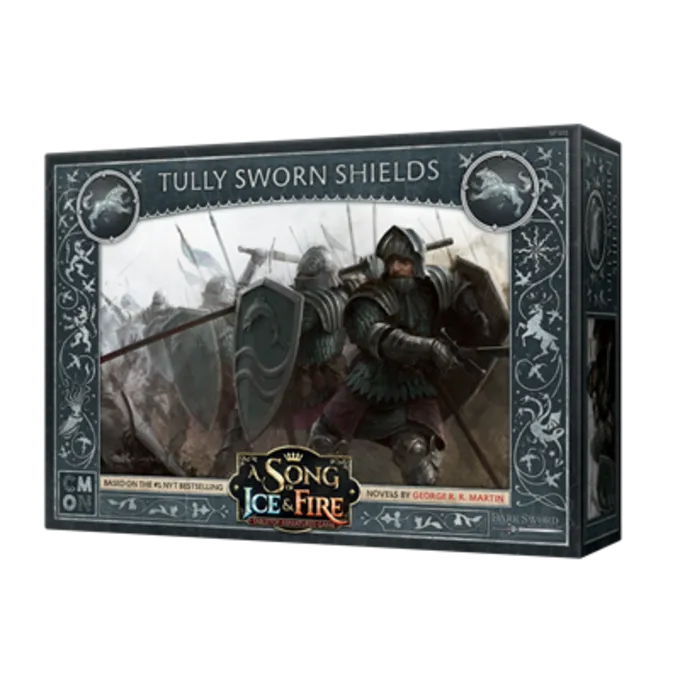 The A Song of Ice & Fire: Tabletop Miniatures -spillet – Tully SwORLY SHIELDS Unit Box giver House Stark -spillere et bolværk på slagmarken. Svorede skjolde kan bruge deres Shieldwall -ordre til at negere hits til deres frontvendte, slukke en fjendens anklager eller efterfølgende angreb mod dem. I mellemtiden viser deres troværdige langord, at denne enhed ikke er helt defensiv. Sættet inkluderer tolv miniatyrer i fire forskellige skulpturer sammen med enhedskortet og bevægelsesbakken.
