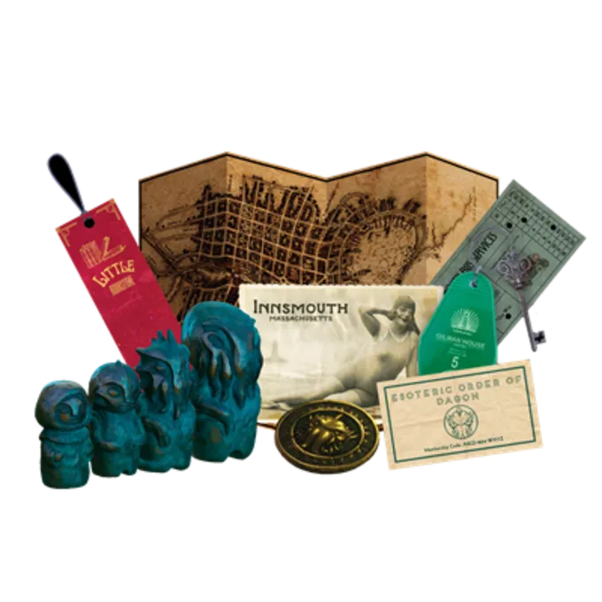 Komponenter: Gilman House Hotel Key, Aged Membership Card, Metal Coin, Curious Postcard, fuldfarve plakat, & NBSP; Strange Bookmark, Mysterious Map, Slidt Ticket og 4 Ancient Totems.