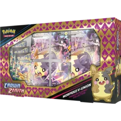 Hver Pokémon Crown Zenith Morpeko V-Union Premium Playmat Collection inkluderer fem Crown Zenith & Nbsp; booster-pakker, fire Morpeko V-Union-kort, et professor Burnet-kort, en playmat og et stort kort.