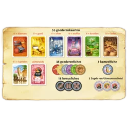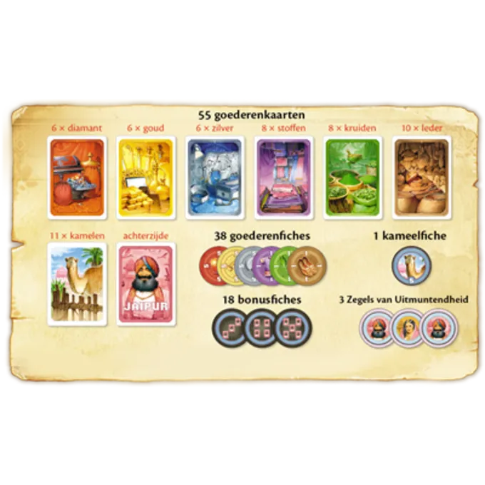 Indhold: 55 varekort (inklusive 11 kameler), 38 varer tokens, 1 kamel -token, 18 bonus -tokens, 3 sæler af ekspertise og en spilmanual.