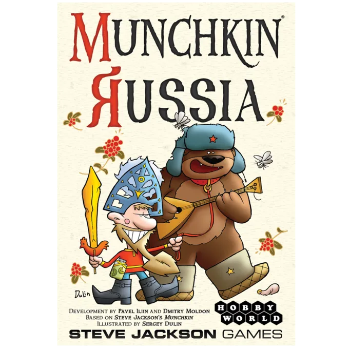 Velkommen til Munchkin Rusland, hvor vittighederne får dig! Gå ind i et land med mysterium, magi og Borsch. Bekæmp troldfabrikken, kgbirds, rasputin eller den frygtede tømmermænd med din russiske ulvehund og Balalaika ved din side. Når du griber plyndring