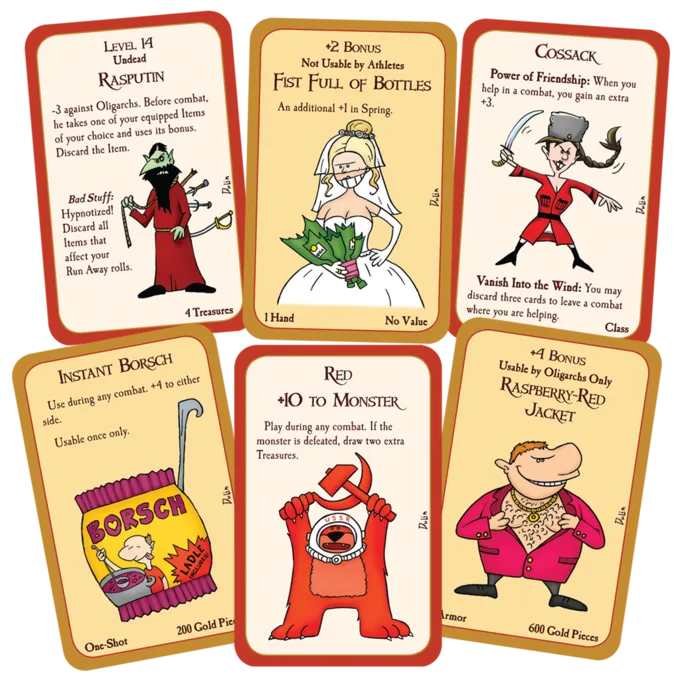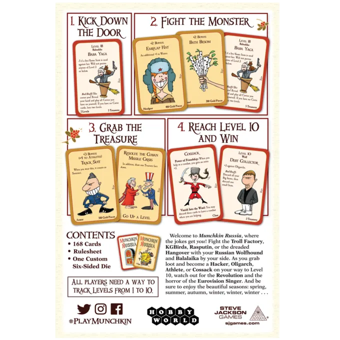 Velkommen til Munchkin Rusland, hvor vittighederne får dig! Gå ind i et land med mysterium, magi og Borsch. Bekæmp troldfabrikken, kgbirds, rasputin eller den frygtede tømmermænd med din russiske ulvehund og Balalaika ved din side. Når du griber plyndring og bliver en hacker, oligark, atlet eller Cossak på vej til niveau 10, skal du passe på revolutionen og rædselen fra Eurovision -sangeren. Og sørg for at nyde de smukke sæsoner: Forår, sommer, efterår, vinter, vinter, vinter …